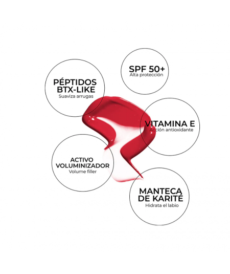 El único labial con muy alta protección solar, antiarrugas que deja los labios suaves y jugosos y con más volumen. Sabor cereza.